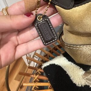 Stylish coach gold and brown patchwork bag perfect for any occasion. Features a unique design with a blend of textures.