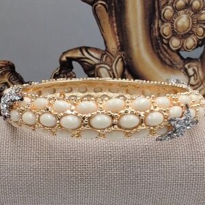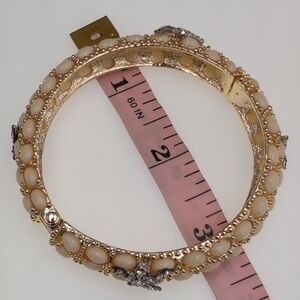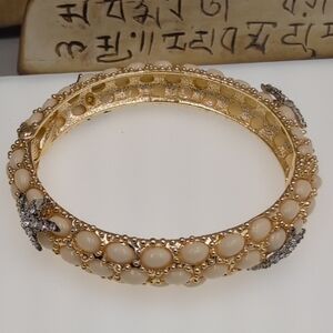 This exquisite bracelet showcases a harmonious blend of gold and cream tones, highlighted by intricate detailing and opalescent elements. Its slip-on bangle design offers a seamless and elegant fit, making it a timeless addition to any jewelry collection.