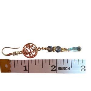 Hand Designed These elegant earrings feature a stunning combination of goldtone cubic zirconia filigree designs and iridescent blue beads. 14k gold plated hypoallergenic fish hook earrings with cubic zirconia stone. Gold tone beads & spacers w/ dangling blue crystal teardrop ..Comes with rubber backs. Perfect for adding a touch of sophistication to any outfit.