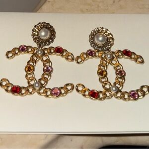 Elegant gold chain earrings featuring vibrant multicolor accents. Perfect for adding a touch of luxury to any outfit.