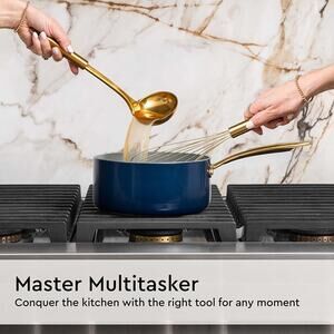 BEAUTIFULLY DESIGNED AND CONVENIENT STARTER SET TO COMPLEMENT GOLD KITCHEN ACCESSORIES eliminate multiple purchases and mismatched utensils; outfit your kitchen with this complete and cohesive set of stylish multi-purpose gold and navy blue cooking utensils set; includes gold tongs, gold ladle, blue silicone spoon, silicone spatula turner, gold whisk, blue spatula, and matching gold utensil holder to keep things organized