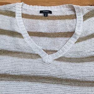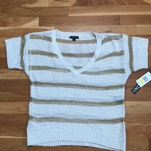 New.... Gold and off white sweater... will need a cami to wear under... sweater is light and slightly see through. Perfect for day to night. Great summer sweater.