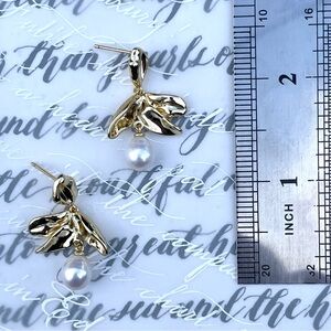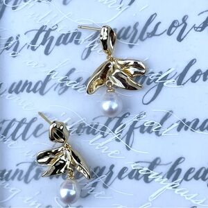 Genuine fresh water pearl. These exquisite earrings feature a gold floral design with a lustrous pearl drop, adding elegance to any ensemble.