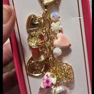 Elegant handbag charm with gold and pink heart accents. Features floral and leaf designs.
