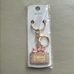 Chic keychain with gold and pink accents. Adorned with sparkling rhinestones. Ideal for bags or keys.