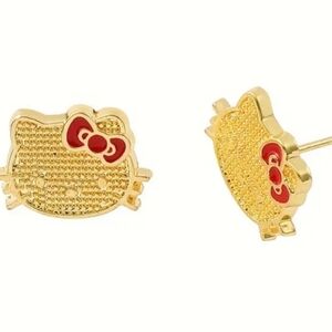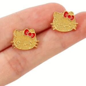 Charming Hello Kitty stud earrings in gold with red accents. Perfect for adding a playful touch to any outfit.