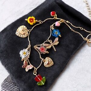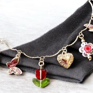 Gold and Red toned Charm Necklace glass rhinestones enamel tulip flowers hearts butterfly dragonfly charms. This vibrant unique necklace features a delicate gold-toned chain adorned with whimsical charms, including red tulip, dragonfly, butterfly, rhinestones and glass colorful flowers, and heart-shaped details. The playful design is fun, feminine and eye-catching, making it a delightful addition to any summer jewelry collection. Adjustable from 15”-17”