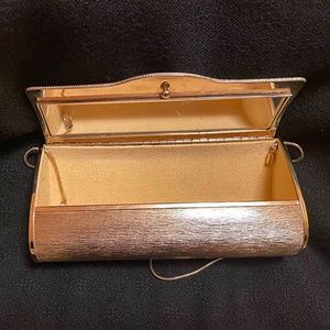 Very sweet hard shell bag for dressing up in style! Maybe 90s. Teardrop shape, brushed gold with a mirror on the inside of the top. Snake chain