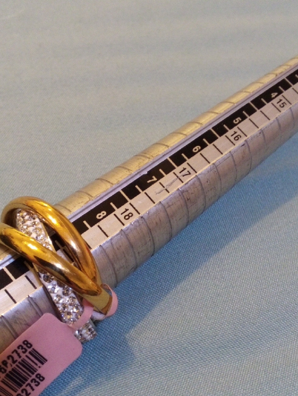 Elegant interlocking ring set. One band is polished gold tone. One band is encrusted with clear rhinestones. Sleek and modern design.