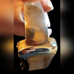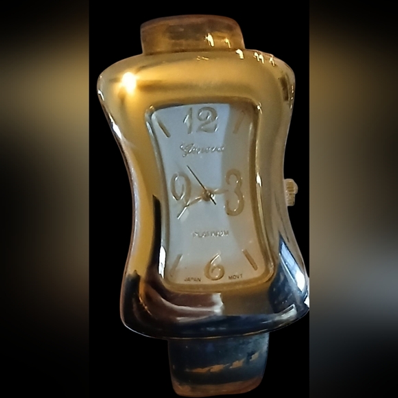Stylish Geneva platinum watch with a unique gold and silver design. Features a curved face and cuff band. Keeps excellent time. I took the last photo with flash on so could see face clearly. Feel free to ask questions.