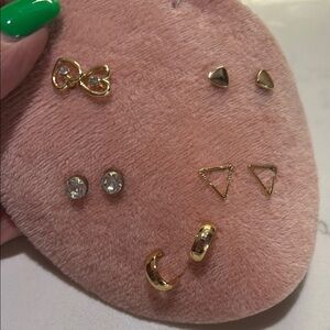 This collection of gold and silver earrings features a variety of minimalist designs, including heart-shaped, bow, and geometric studs. Each piece is crafted with a dainty and elegant finish, perfect for everyday wear. The set offers a versatile mix-and-match style, adding a touch of sophistication to any outfit.