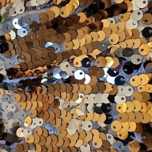 Gold light-catching sequins with silver interior and back panel. Large gold accent ball closure. Removable chain strap to use as a clutch if desired. Measures 11x6 inches.