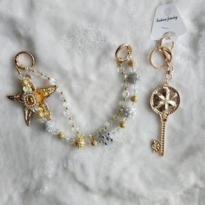 This features a double-strand chain adorned with various beads in clear, white, and gold tones. The beads include faceted clear beads, textured gold beads, and white beaded spheres. It connects to a gold-toned ring at the top that can be connected to your purse! Also comes with a single, ornate key-shaped key chain charm. The key's handle is intricately designed with a large, snowflake-like cluster of clear rhinestones, while the shaft and teeth are a polished gold tone. It is attached to a gold-toned clasp and ring, suitable for a keychain or bag attachment.