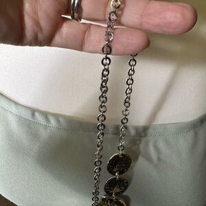 This exquisite fashion necklace showcases a harmonious blend of gold and silver hues, featuring an array of shapes and sizes. Its long, elegant design makes it a standout accessory, perfect for adding a touch of sophistication to any ensemble. Has weight to it.