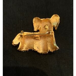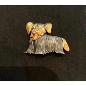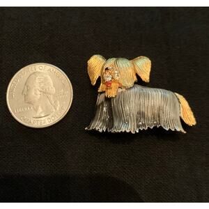 Adorable gold and silver tone terrier dog brooch vintage. Silver tone body with gold tone head and tail. Clear rhinestone crystals around small black nose and little red tongue. Brooch measures 1.50 inches wide and 1.25 inches tall. No markings and in amazing condition.