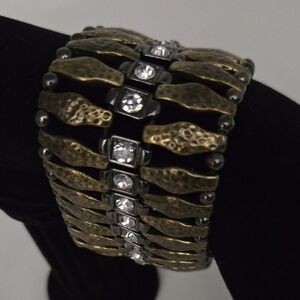 This bold bracelet showcases a striking combination of gold and silver tones, with a textured design featuring raised circular elements. Its substantial width and shimmering metallic finish make it a standout piece for any occasion.