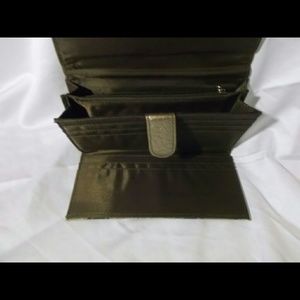 SO MANY POCKETS. A chunky tan clutch with Barker brown and gold accents. Snap closures. Zippered inner pockets as well as spots for several cards.