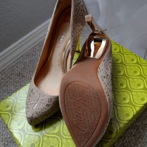 Tan and gold Gianni Bini high heels. Worn a handful of times (sole is like new!). I tapped shoe inserts and it slightly removed the upper layer of the insole.
