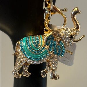 Elegant gold and teal elephant keychain with sparkling details. Perfect accessory for bags or keys.