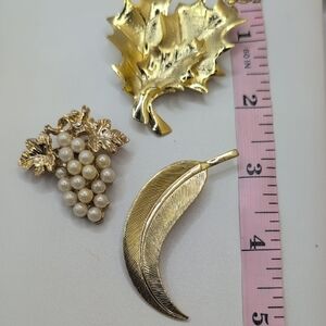This elegant brooch set showcases a harmonious blend of gold and white hues, featuring a grape cluster design with delicate white beads, a textured goldtibe maple leaf, and a sleek crescent-shaped piece. Each brooch is crafted to add a touch of sophistication and charm to any ensemble. Excellent condition unsigned brooch lot.