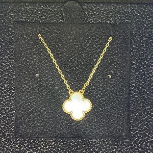 This beautiful necklace features a gold chain with a white clover pendant, perfect for any occasion.