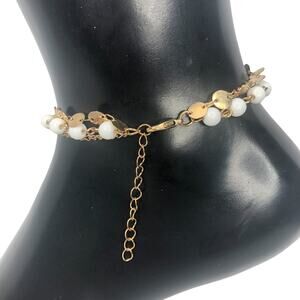 Gold and White Triple Strand Leaf and Beads Anklet