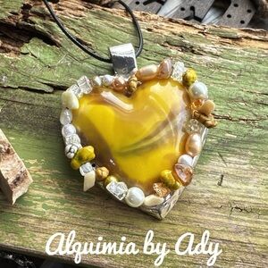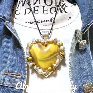 This stunning necklace features a heart-shaped pendant crafted from a vibrant yellow material, encased in a gold-toned metal frame with intricate detailing. The pendant hangs elegantly from a contrasting dark chain, creating a striking visual appeal. Perfect for adding a touch of warmth and richness to any outfit.