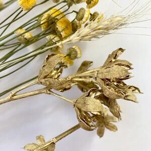 Dried flower arrangement created with Matricaria, Wheat and Hibiscus seed pods painted in gold. Long lasting dried flower bouquet.
