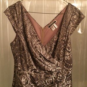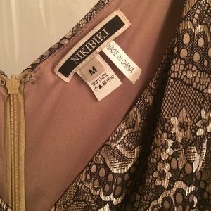 This dress Is made by nikibiki, and it's GORGEOUS!! I did take the tags off, but I have never worn it before. It's absolutely stunning and falls right about 4 in from the knee and I'm 5'5. It has a small slit on the left side that just makes it beautiful on. It's the perfect party dress, or dinner, or just a hang out. It's beautiful. It falls perfect on the chest, not too low. It's extremely well made and very soft on the inside.
