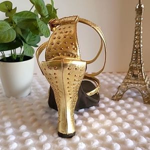 Gold and brown strappy sandal wedges with gold studs. Sophisticated and stylish for summer! Size 9 with 4.5" wedge heel. Ships the same/next day, Monday-Friday with the exception of holidays. Packaged with care.