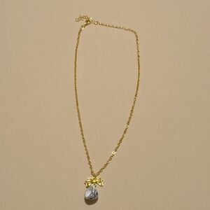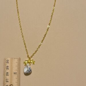 Elegant gold and blue necklace featuring a charming bow pendant. Perfect for adding a touch of sophistication to any outfit.