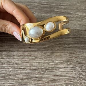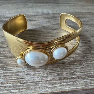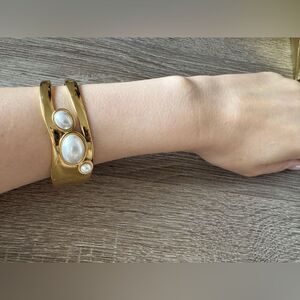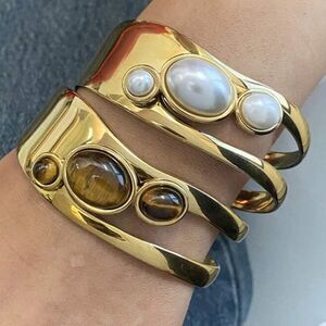 This stunning gold cuff bracelet features elegant white accents, perfect for adding a touch of sophistication to any outfit. Stainless steel in 18k gold plated hardware and waterproof