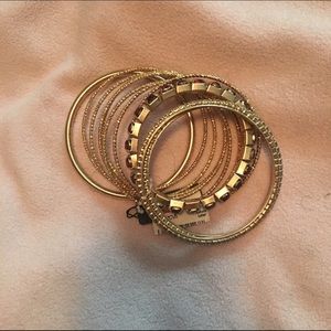 11 gold bangles one with red jewels some have clear diamond like jewels new with tags they are one size fits all