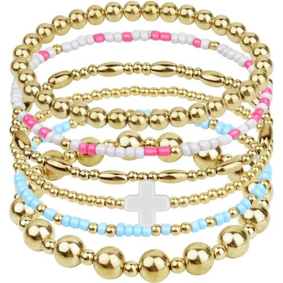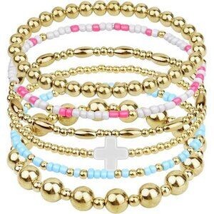 Gold beaded bracelet set 14k plated dainty cross stack stretch layered jewelry g