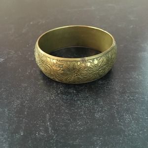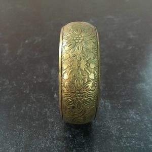 Gold brass floral etched bangle bracelet 2.5" across the center 1" wide