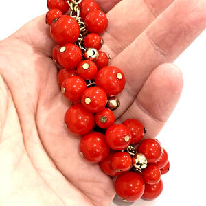 Gold chain bracelet covered with various size red beads and smaller goldtone beads - beaded dangles give lots of movement - fun retro look with bright colors. Fashion jewelry - no hallmarks - lobster clasp. In excellent pre-owned condition - no flaws.