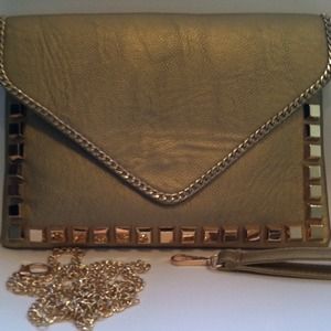 Gold clutch with studs. Detachable chain and wrist strap. NWOT. Faux leather. Zip top closure under flap. Price posted is including discount and is firm. No trades or reserves/holds.