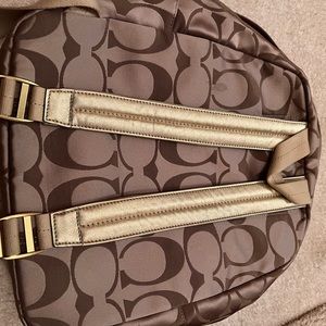 Preloved gold coach backpack with purple lining. A few pulls in the fabric and small stains as shown. Includes water bottle pocket inside. Lots of love left! Haven’t tried cleaning it.