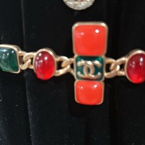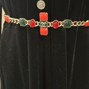 Elegant gold color chain belt featuring vibrant red and green accents. Perfect for adding a touch of luxury to any outfit.