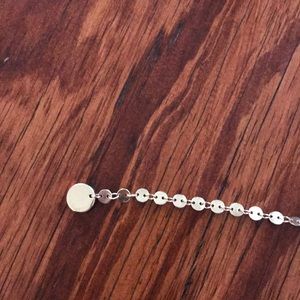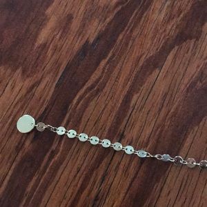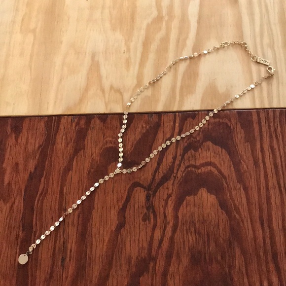 Gold necklace is 12 inches long around the neck and has a dangle portion chain that is 6 inches with a round circular gold plated pendant. This necklace is adjustable by clasping to a lower ring as seen in the photos.