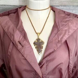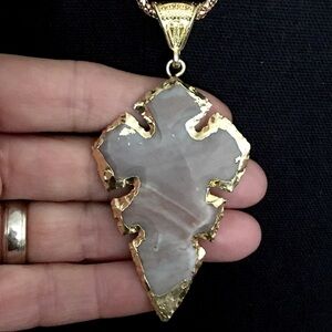 Bold, brilliant 24k gold foil edged hand carved notched chert stone arrowhead necklace with gold plated 3mm spiga chain 32“ long; pendant 3.5” long.