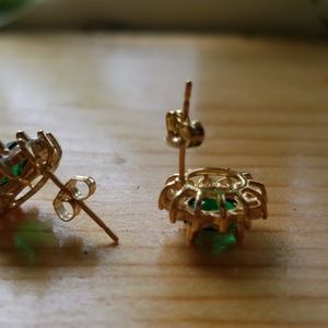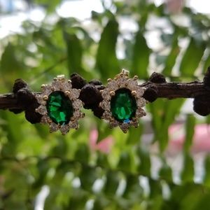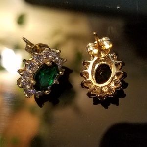 Gold plated earrings, luminous green center stone surrounded by brilliant clear stones. SPARKLY! Never worn.