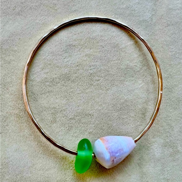 Handmade in Hawaii, gold filled bangle with Seaglass and shell. I am a jeweler from Hawaii and I make beautiful shell jewelry. The bangle comes in size 8 can customize to a 7 1/2 or an 8 1/2 depending on the size. Please be aware that shell color, and Seaglass color will vary somewhat due to the natural nature of them.