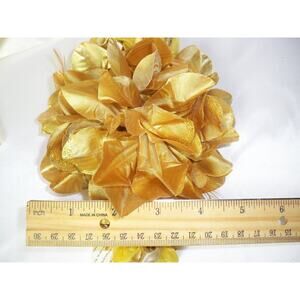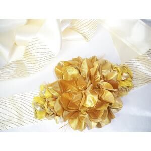Beautiful gold glitter overlay with gold flower applique evening formal wear belt sash. Perfect for any special occasion. The double faced sating ribbon is 108 inches long. The gold stripe overlay is 33 inches long and the flower applique is 7 inches long. #35
