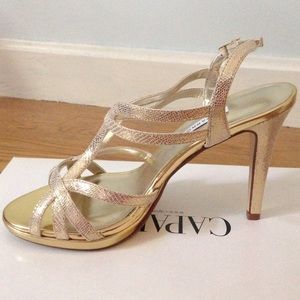 Purchased at DSW. Extremely stylish strap gold heels, perfect for any formal occasion! Never worn and in brand new condition.