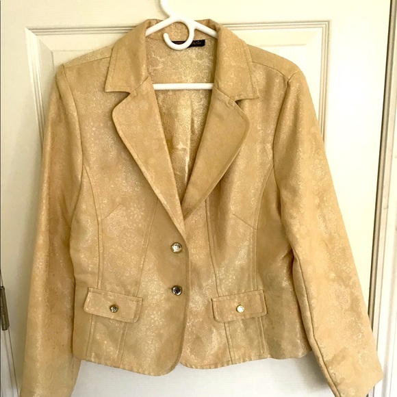 Gold waist length jacket with collar and long sleeves and 2 buttons down the front. 2 faux pockets on front. Polyester and rayon dry clean only.