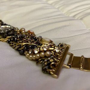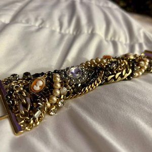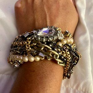 I bought this jeweled cuff/bracelet about 11 years ago from Banana Republic, but I haven't EVER worn it because it is a bit big for my wrist. Gold chain links are embedded with different costume jewelry stones, like a broach, a pearl, etc. (see pictures) I have ALWAYS loved, loved, loved this bracelet because of its style. It's POSH. It's CHIC. It's still very much in style, too! Really makes for good wrist candy! Beautiful! You cannot find this bracelet anywhere, anymore. GREAT BUY for the fashionista!