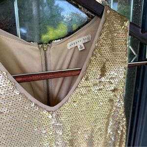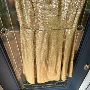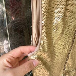 Gold matte shiny sequin sleeveless fit and flare v neck medium dress knee length. Excellent condition. No holes or stains. One thread showing, pictured. Is lined. No pockets. No stretch.