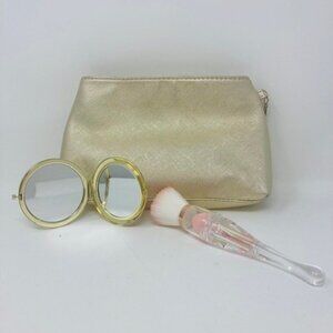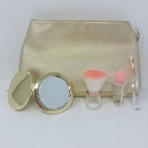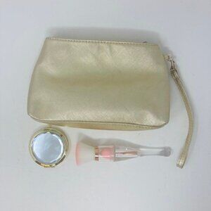 Gold metallic cosmetic bag with compact mirror and 3 in 1 brush set