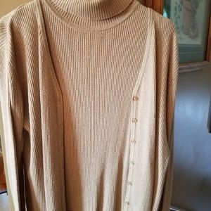 I loved this set! Gold with metallic flecks. the turtleneck is sleeveless so you won't get overheated in it. The sweater matches the turtleneck It is waste length. Goes perfect with the pleather (leather) black skirt I have in my Poshmark closet